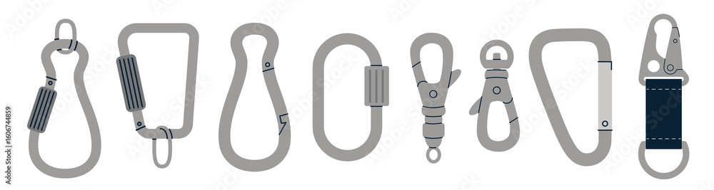 Tableau sur toile Set of metallic carabiners, clips and snap hooks for bags and keychains