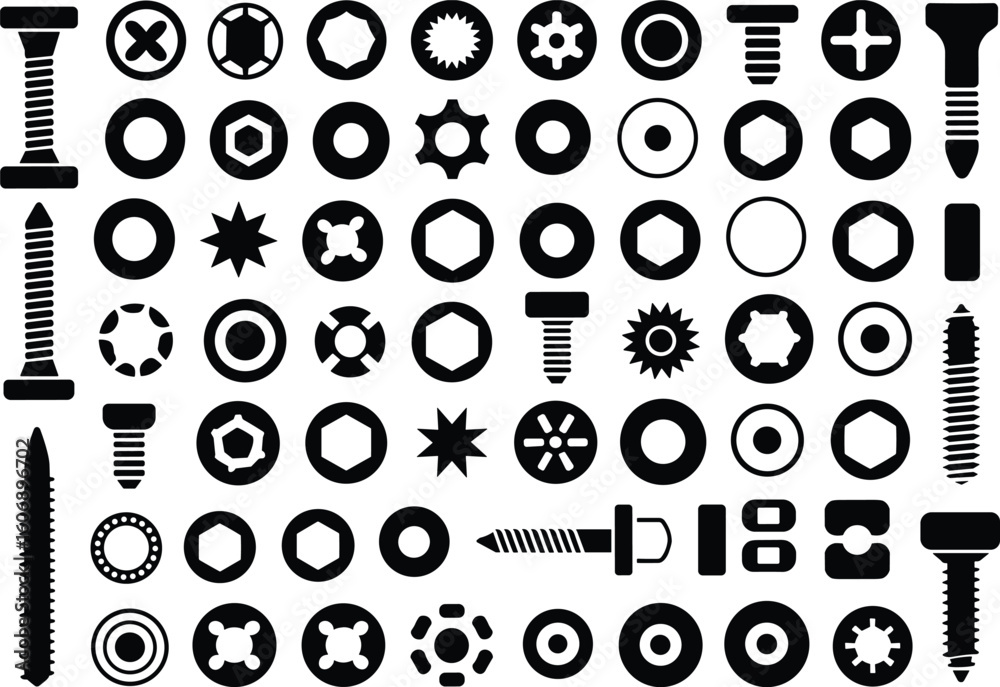 Tableau sur toile Black silhouette screw head, bolt top, nut and washer icon set for mechanical, i