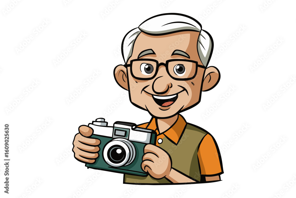 Tableau sur toile Smiling elderly man with glasses enthusiastically holding a vintage camera ready