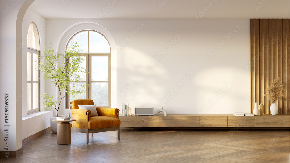 Tableau sur toile A cozy and warm living room interior with natural light, wooden floors, and an armchair against warm white walls