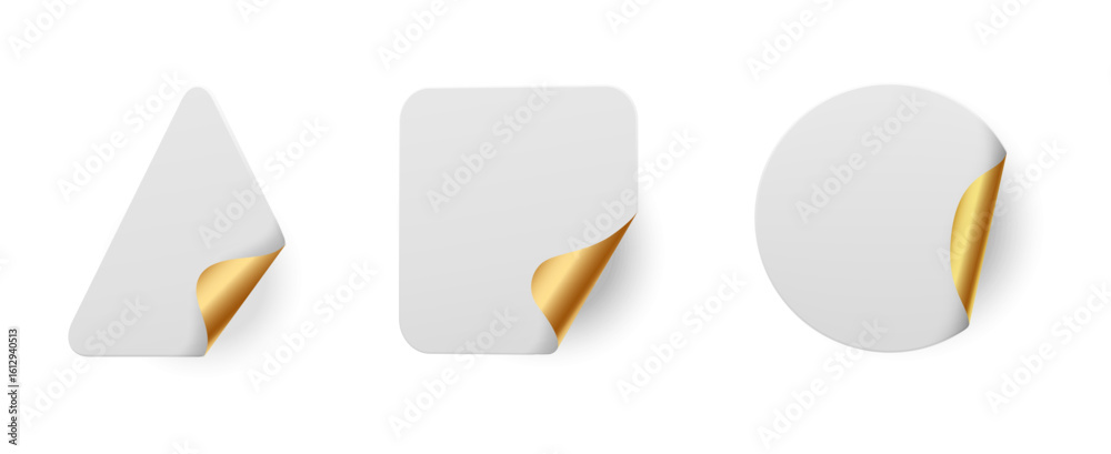 Tableau sur toile White paper stickers with gold corner peels revealing shiny metallic backing - blank geometric stickers with curled edges