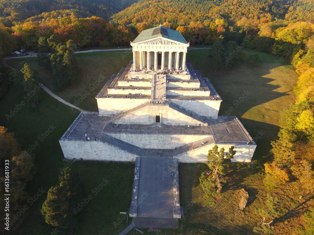 Tableau sur toile Walhalla Regensburg in autumn evening drone shot