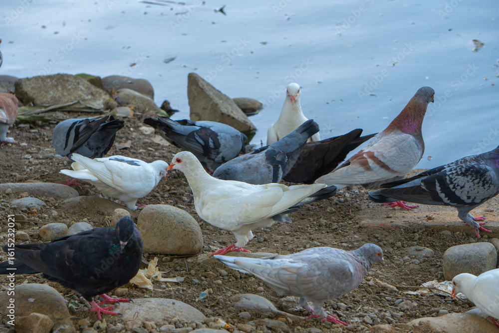 Tableau sur toile Small flock of pigeons pecking on rocky seaside ground under daylight