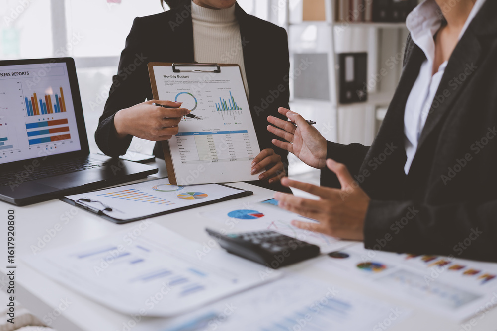 Tableau sur toile Businesswomen analyzing financial reports and discussing monthly budget