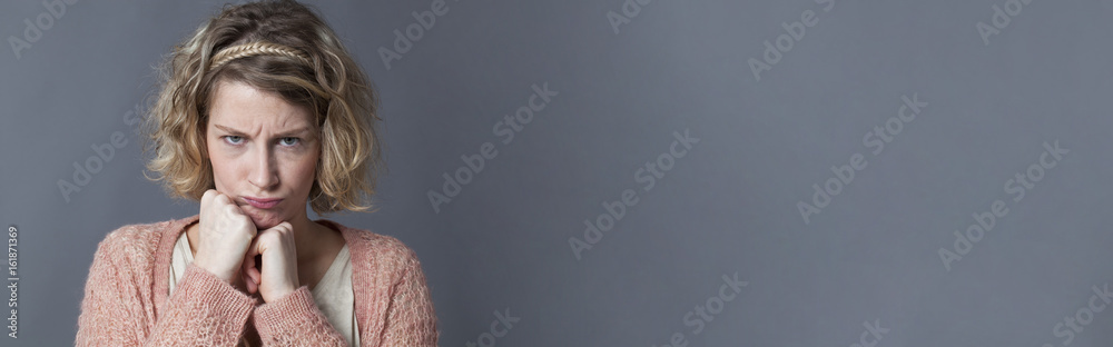 Tableau sur toile frustrated young childish woman sulking with fists under chin