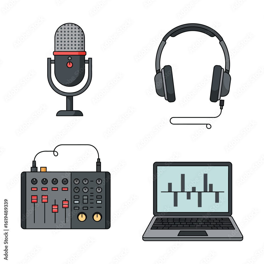 Tableau sur toile Studio Recording Equipment Icons Microphone Headphones Mixer Laptop