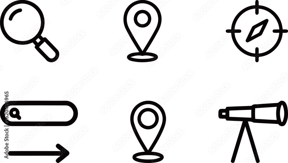 Tableau sur toile Search, Location, and Navigation Icons: Magnifying Glass, Pin, Compass, and Tele
