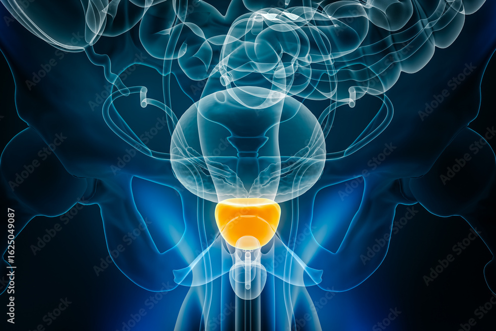 Tableau sur toile X-ray anterior or front view of the prostate 3D rendering illustration with male body contours