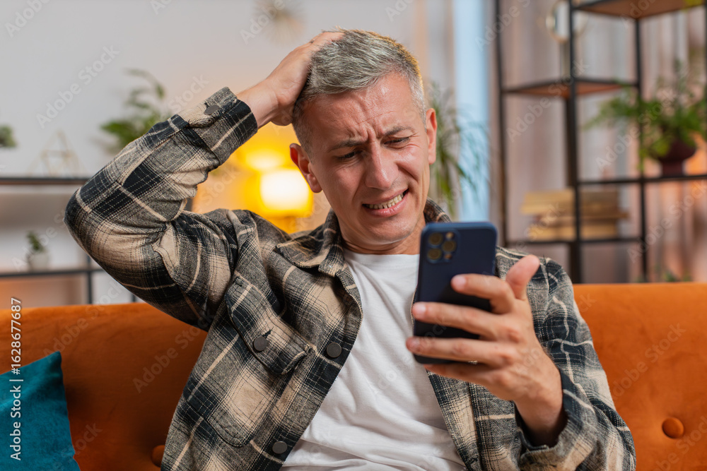 Tableau sur toile Sad displeased Caucasian man using smartphone typing browsing, loses becoming surprised sudden lottery game results, bad news, fortune loss, fail, deadline, virus
