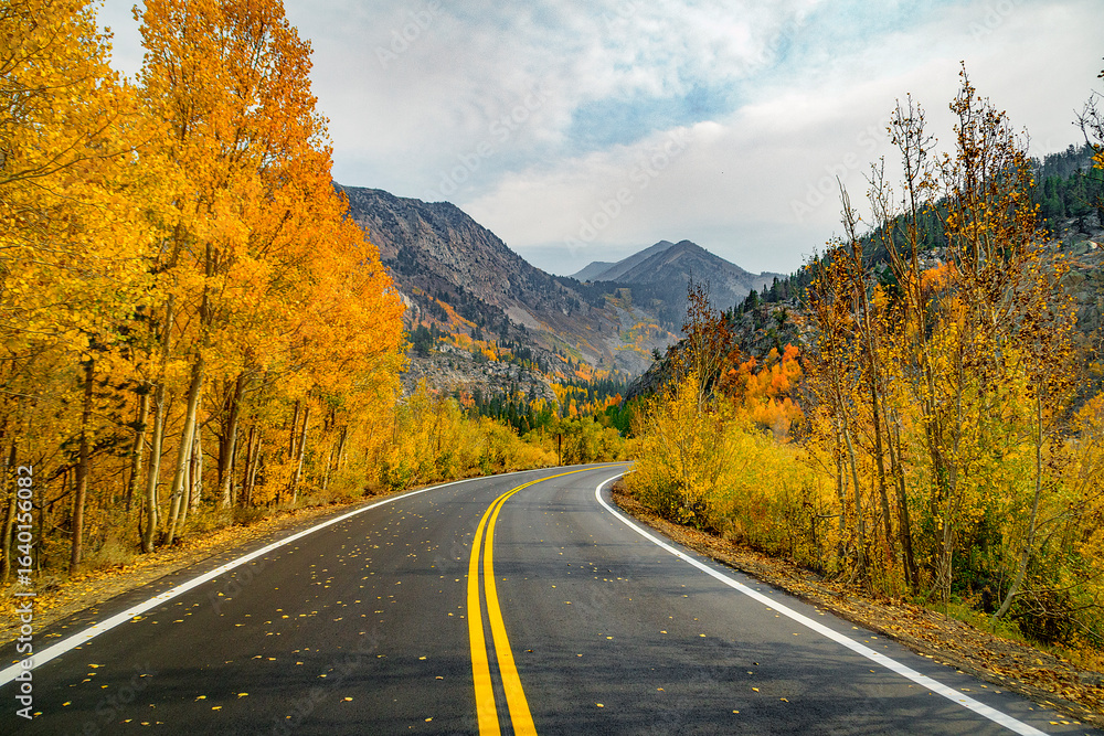 Tableau sur toile Scenic autumn landscape on South Lake Road near Bishop, California, with golden fall foliage lining the curved mountain road under a dramatic sky