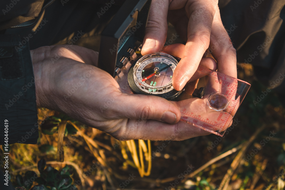 Tableau sur toile two male hands hold compass while person appears focused on navigating through dense forest on sunny day