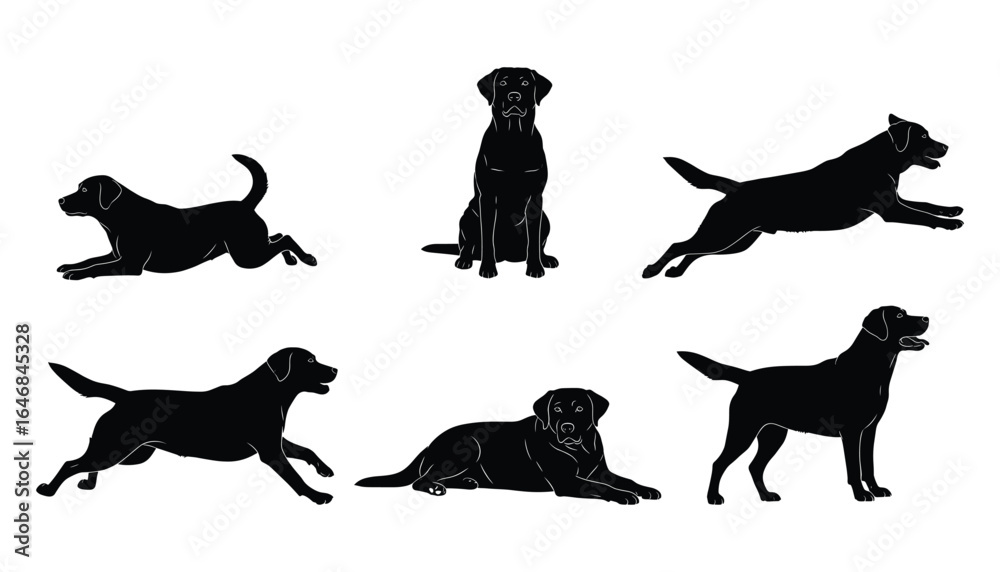 Tableau sur toile Black Labrador Retriever Silhouettes in Various Poses on White Background Canine