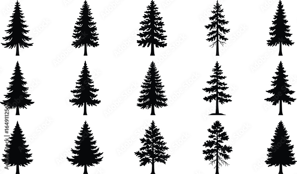 Tableau sur toile Evergreen tree silhouettes, pine and fir black icons, forest vector collection,
