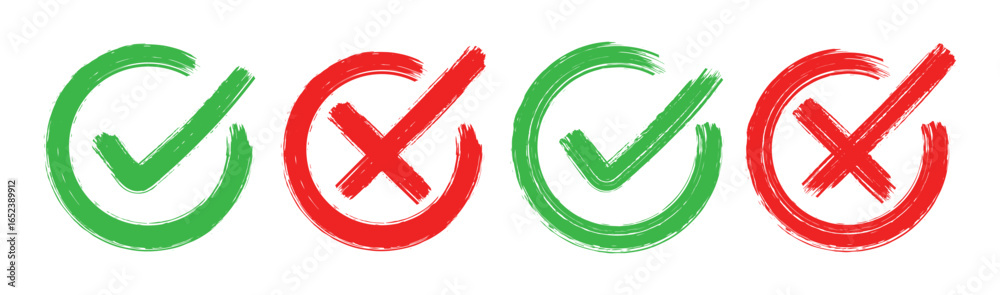 Tableau sur toile Set hand drawn check mark, tick and cross brush signs, checkmark OK and X icons,