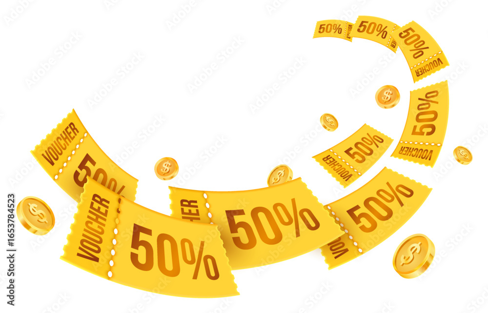 Tableau sur toile Golden 50% discount vouchers swirling with gold coins on a white background, perfect for promotional banners, sales campaigns, and marketing designs