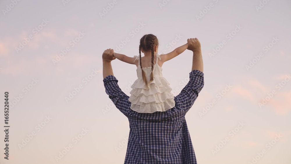 Tableau sur toile concept father and daughter, happy family life, walk dad and child sitting on shoulders astride nature, happy child ride dad, persons play fun game together, little kid dreams of flying, being pilot