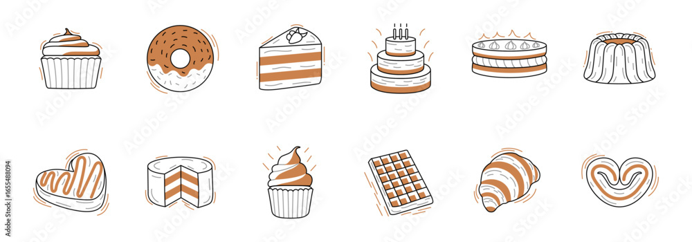 Tableau sur toile A collection of illustrated bakery items including cakes, cupcakes, pastries, and cookies, in a simple line art style