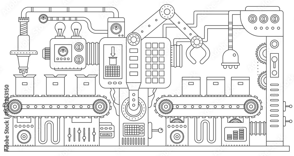 Tableau sur toile Industry production, manufacture and conveyor machines thin line infographic vector illustration
