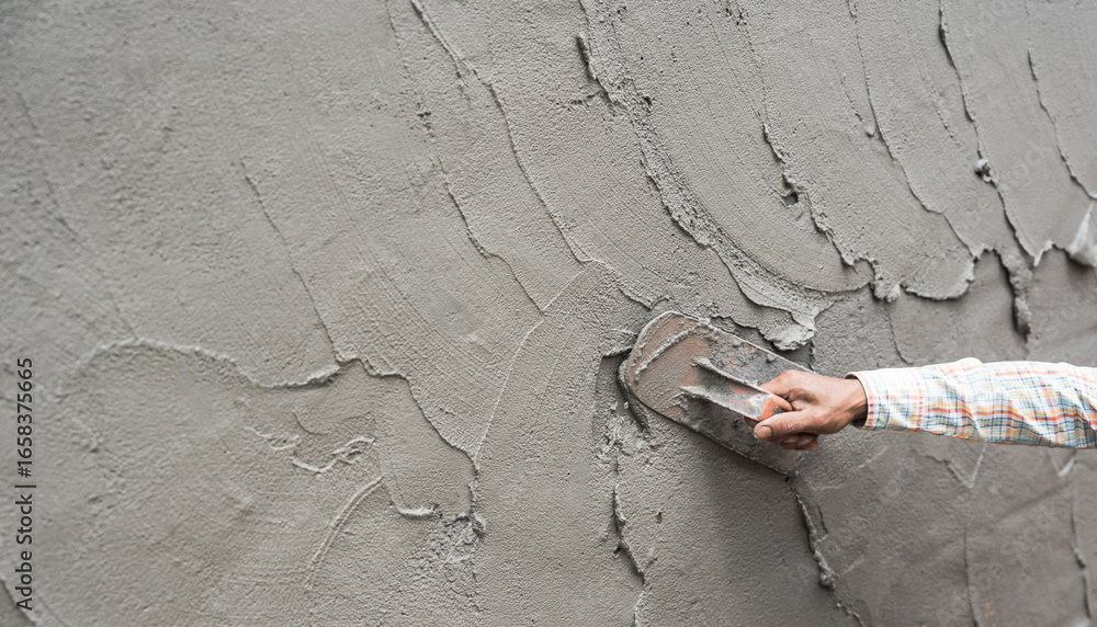 Tableau sur toile Hand plaster plastering Cement wall background with Rough wet concrete mortar pl