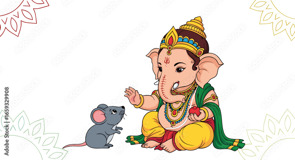 Tableau sur toile Cute Baby Ganesha with Mouse: Adorable Cartoon Illustration Colorful Lord Ganes