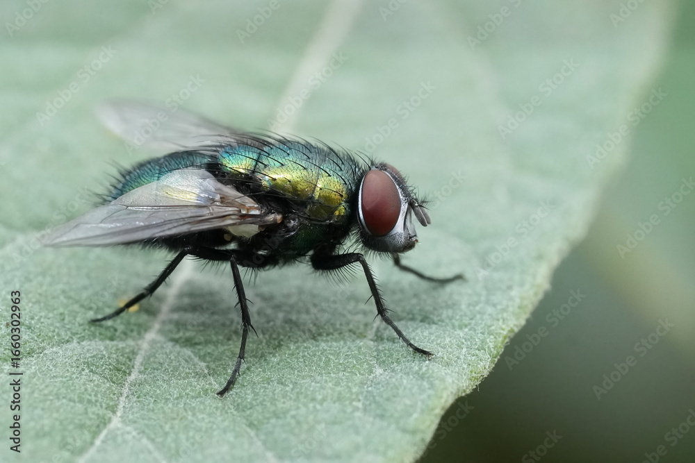 Tableau sur toile Detailed closeup on a Common European bottle fly, Lucilia sericata on a green le