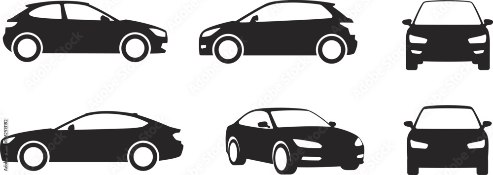Tableau sur toile Black car silhouette vector set, hatchback and sedan, side view, front view, rea