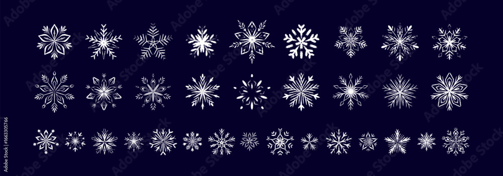 Tableau sur toile Set of white chalk snow flake drawings of dark blue blackboard