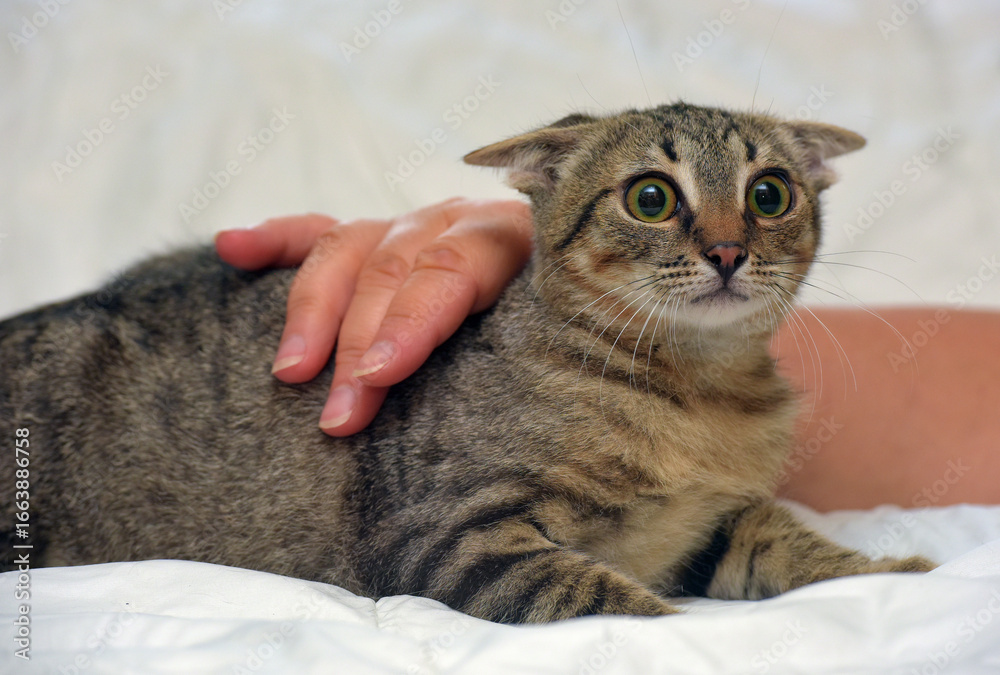 Tableau sur toile a tabby cat with distinct green eyes, lying on a light background