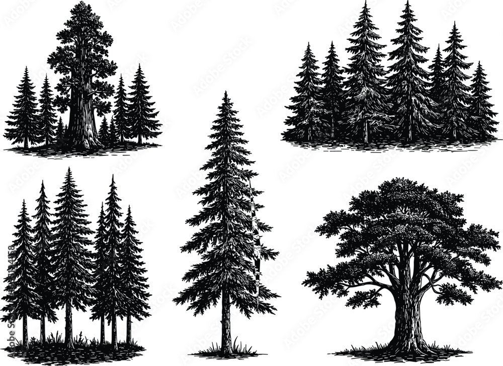Tableau sur toile Forest Trees Silhouette Set Vector Illustration, Pine Fir Evergreen Redwood Deciduous Park Woods Collection, Nature Environment Engraving Style Design