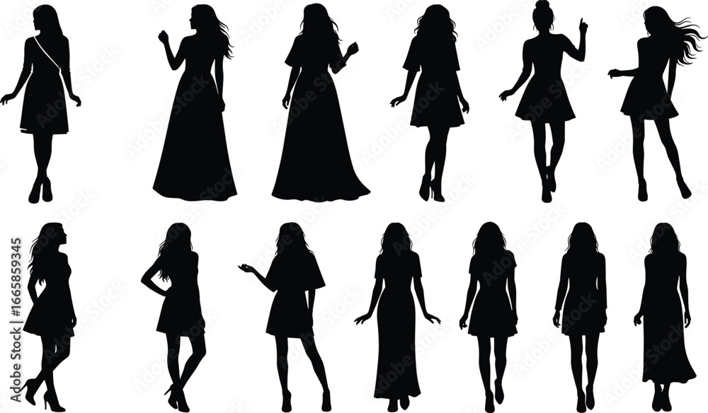 Tableau sur toile Silhouettes of fashionable women in dresses, walking and posing, elegant female