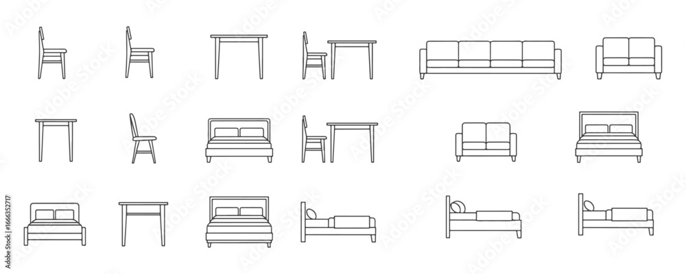 Tableau sur toile Minimal CAD style line drawing of furniture elements including chairs, tables, b