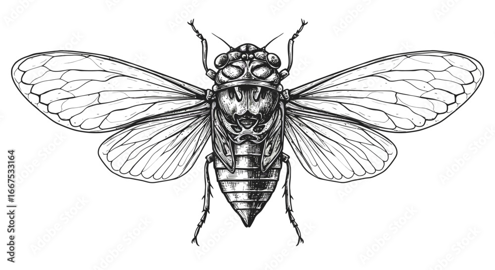 Tableau sur toile Detailed Black and White Cicada Illustration with Veined Wings.