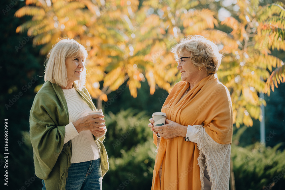 Tableau sur toile Two senior women enjoying coffee and conversation in autumn park
