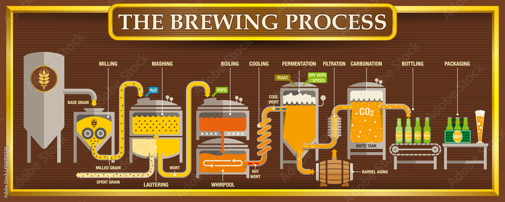 The Brewing Process info-graphic with beer design elements on brown background with golden frame. Vector image