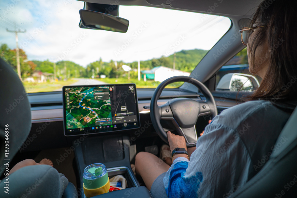 Tableau sur toile Woman drive modern EV car with GPS navigator travel in nature village