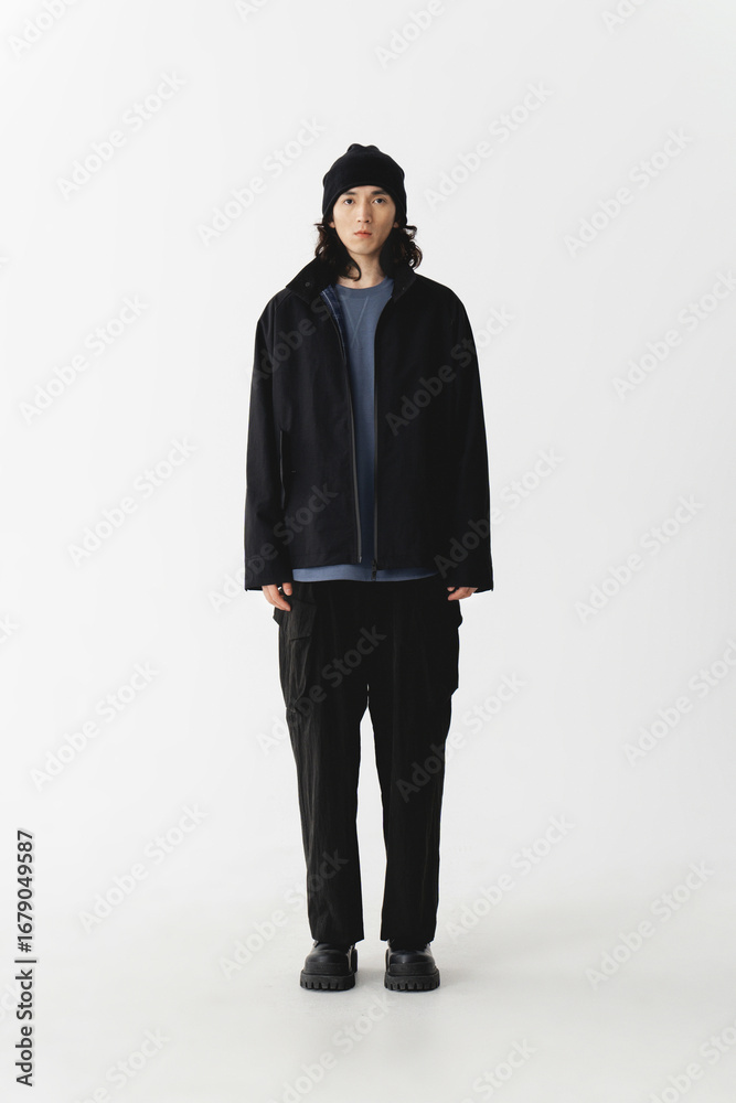 Tableau sur toile Young man in casual black jacket and cargo pants standing in a minimalistic studio