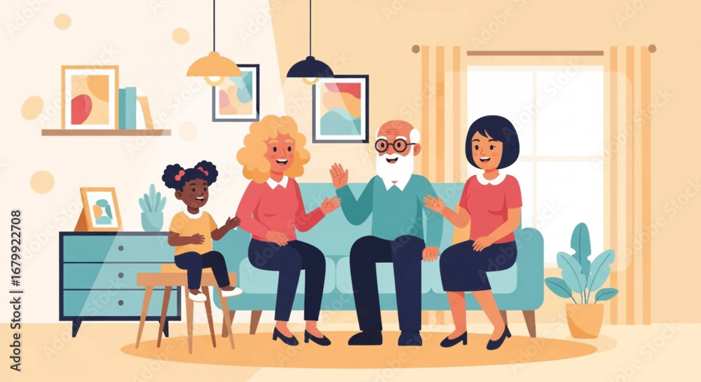 Tableau sur toile Happy multi-generational family bonding and smiling together in a cozy living room, symbolizing warmth, connection, and cherished moments
