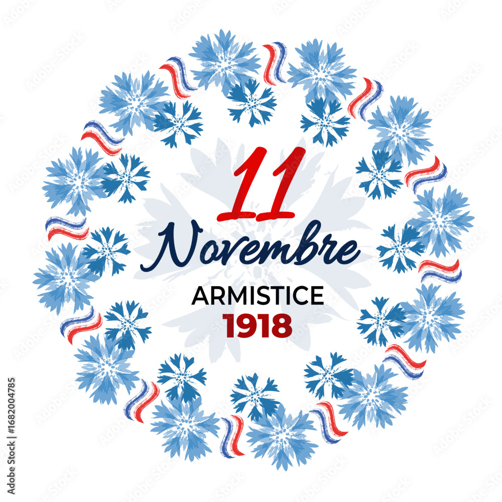 Tableau sur toile Vector wreath with blue cornflower flowers and French tricolor ribbon for 11 November Armistice Day 1918, in French