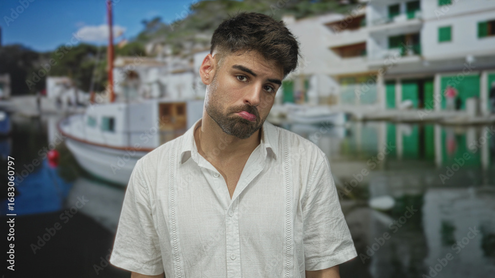 Tableau sur toile Man in white shirt pouts lower lip beside a wooden boat docked at a sunny port; melancholy introspection