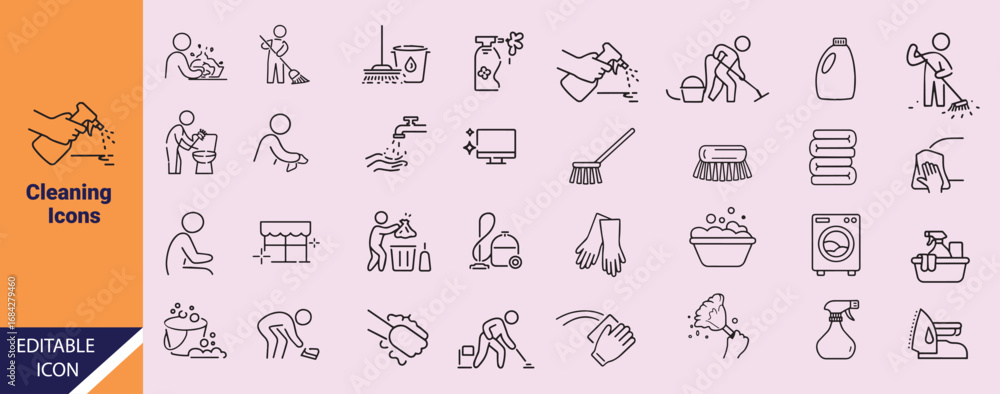 Tableau sur toile Black line icons demonstrate people doing various housework chores on white surf