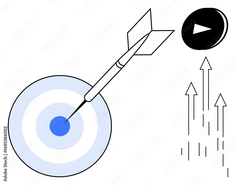 Tableau sur toile Dart hitting bullseye on target, upward-pointing arrows, and play button suggest focus, goals, success, and momentum
