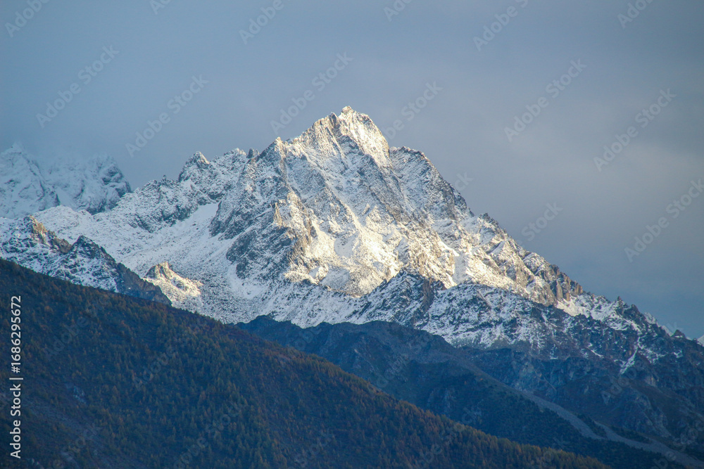 Tableau sur toile Jagged, snowy peaks loom under a cloudy sky Yala Snow Mountain, Sichuan, China
