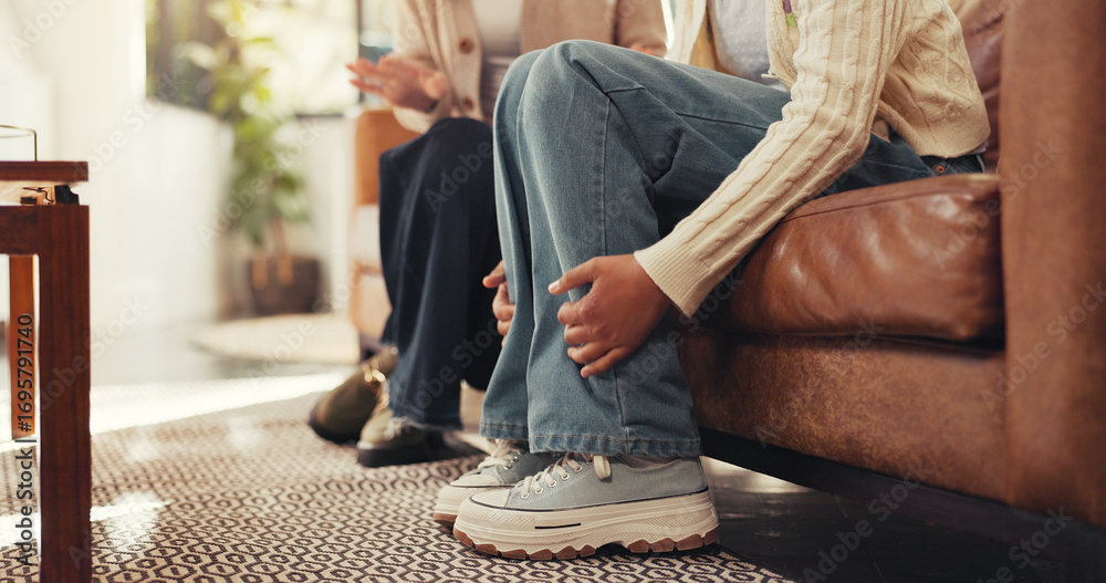 Tableau sur toile Legs, parent and child in reprimand on couch, conversation or support in lesson