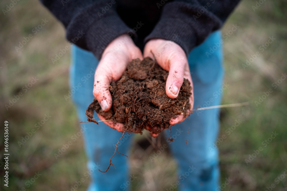Tableau sur toile modern young farmer collecting soil samples in a test tube in a field