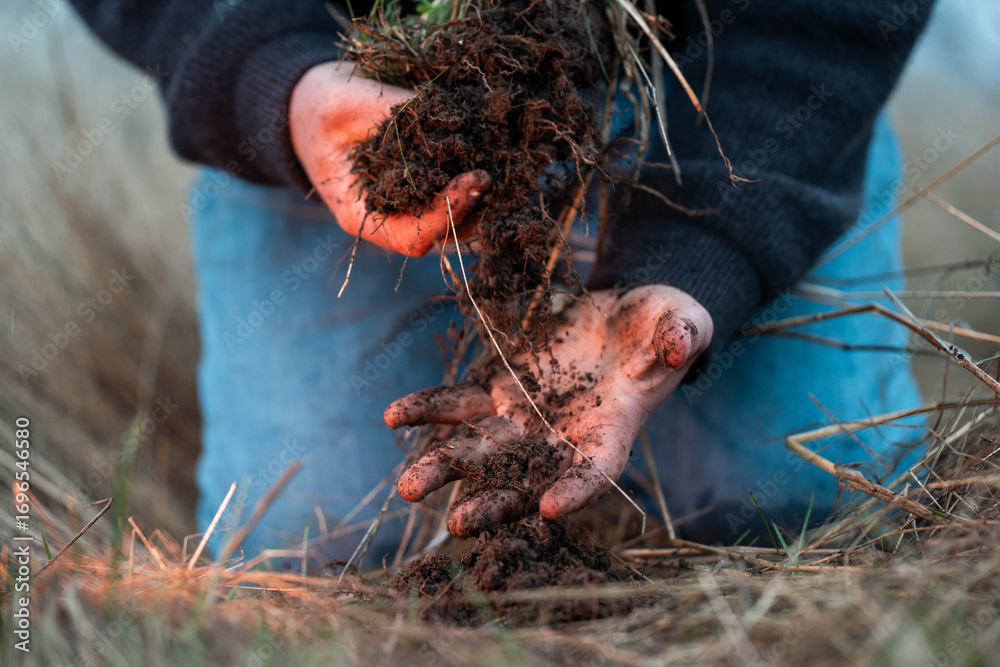 Tableau sur toile farmer collecting soil samples in a test tube in a field