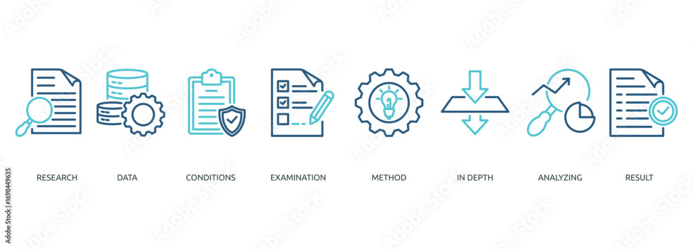Tableau sur toile case study outline color banner icon of research, data, conditions, examination,