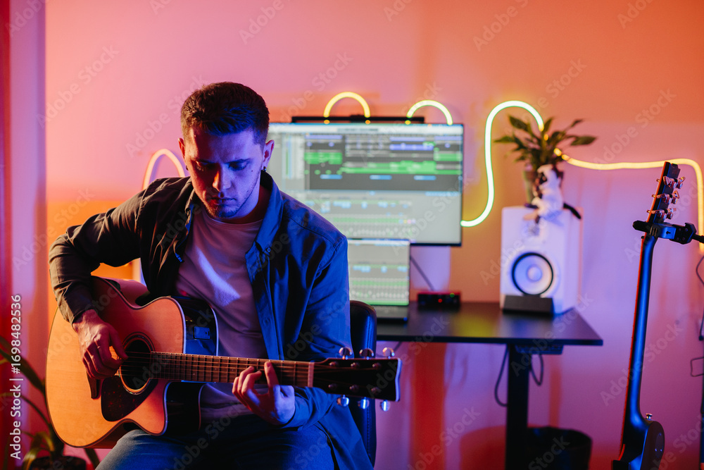 Tableau sur toile Musician composing new song playing acoustic guitar and using music production s