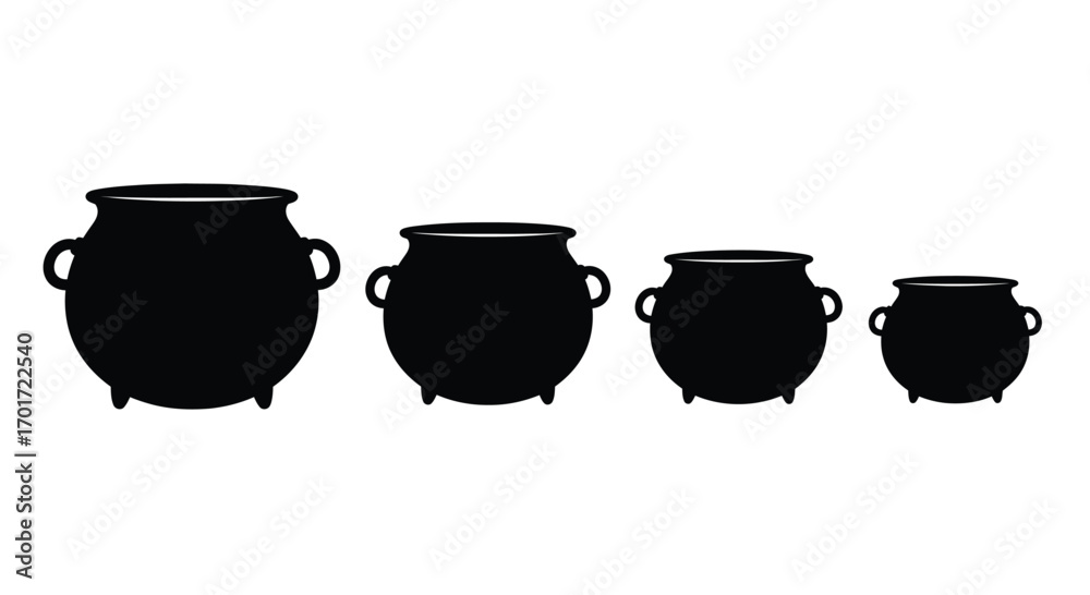 Tableau sur toile Four black cauldron silhouettes of varying sizes ready for magic potion brewing