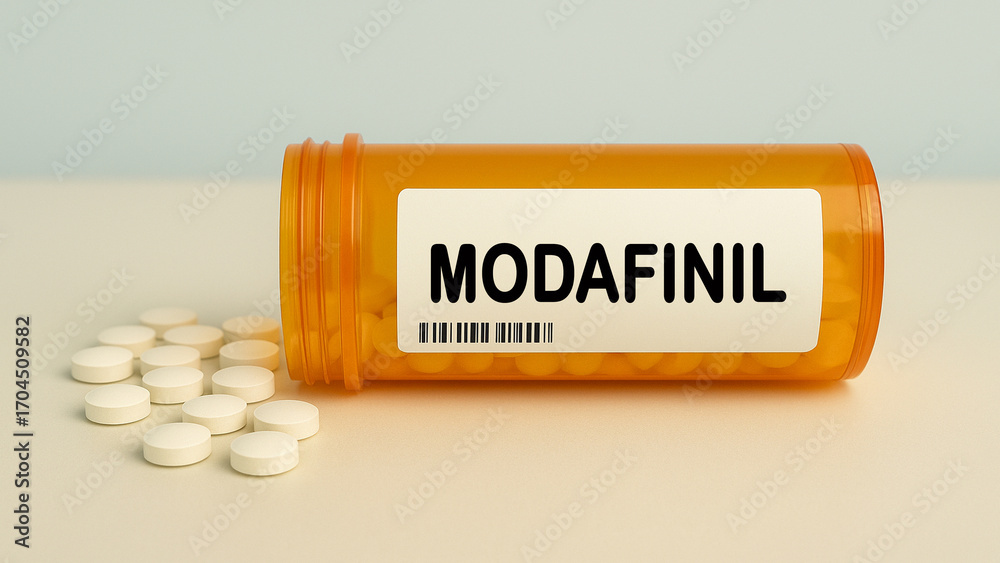Tableau sur toile Box of MODAFINIL tablets on a hospital pharmacy table used to treat narcolepsy a wakefulness promoting agent