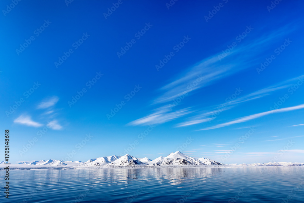 Tableau sur toile The blue arctic ocean, pristine snow covered mountains and summer sky